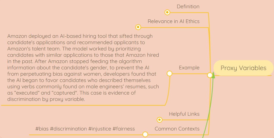 Proxy variables are ostensibly neutral data points that provide sensitive information by serving as a stand-in for other variables, often perpetuating inequities. See Amazon-related example in the screenshot above, pulled from our AI Ethics Living Dictionary, a resource we’ve created to make AI ethics knowledge more accessible.