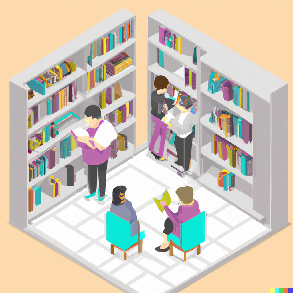 Generated using DALL-E 2 with the prompt “isometric scene with high resolution in pastel colors with flat icon imagery depicting researchers reading books in a university library“