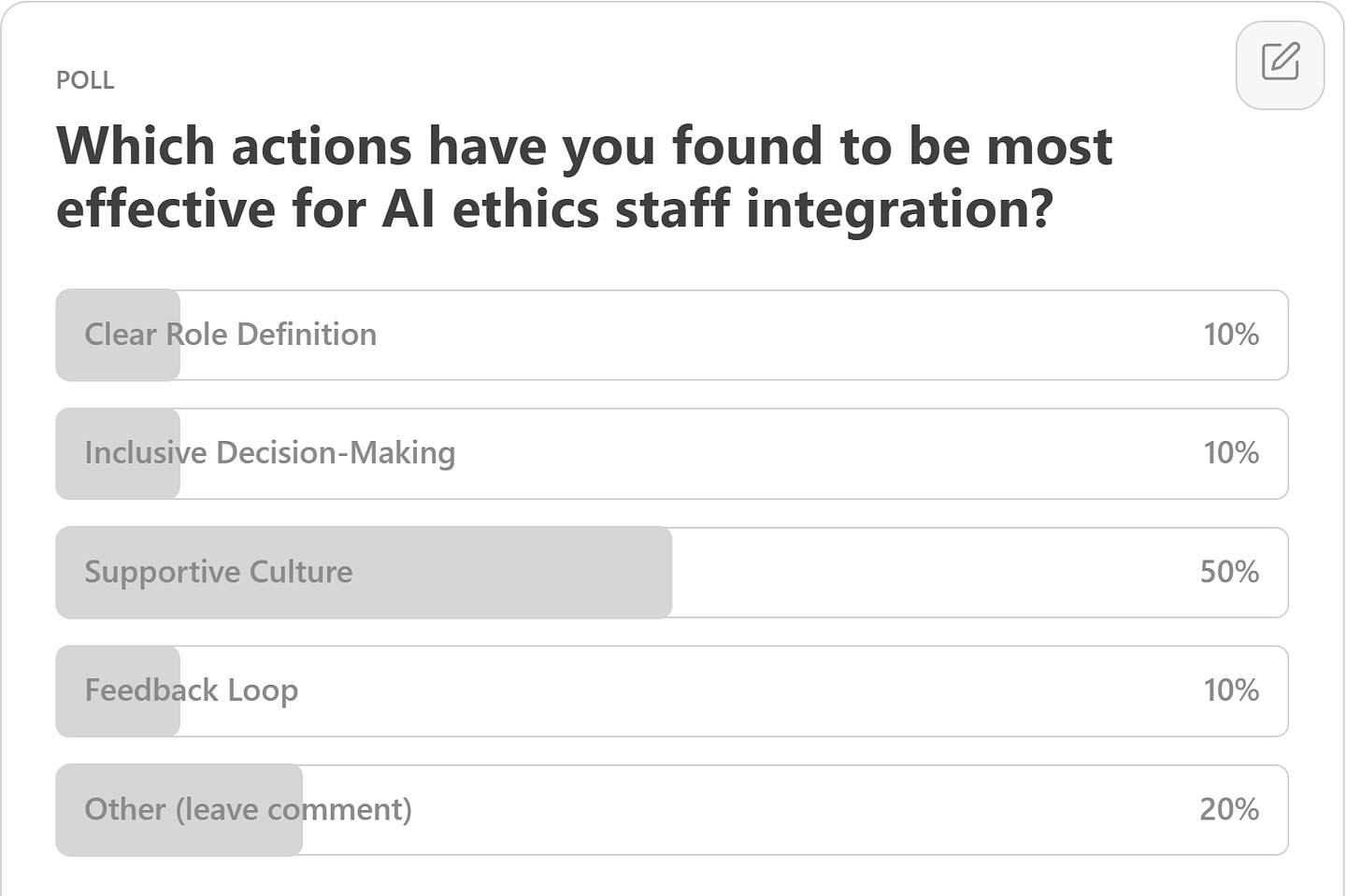 Absolutely agreed with how our community has responded to the above question, having a supportive culture is one of the prime requirements for staff working on AI ethics to be effective in their roles, especially given the fraught nature of the challenges and (sometimes) misaligned incentives that exist between ethical and business goals.