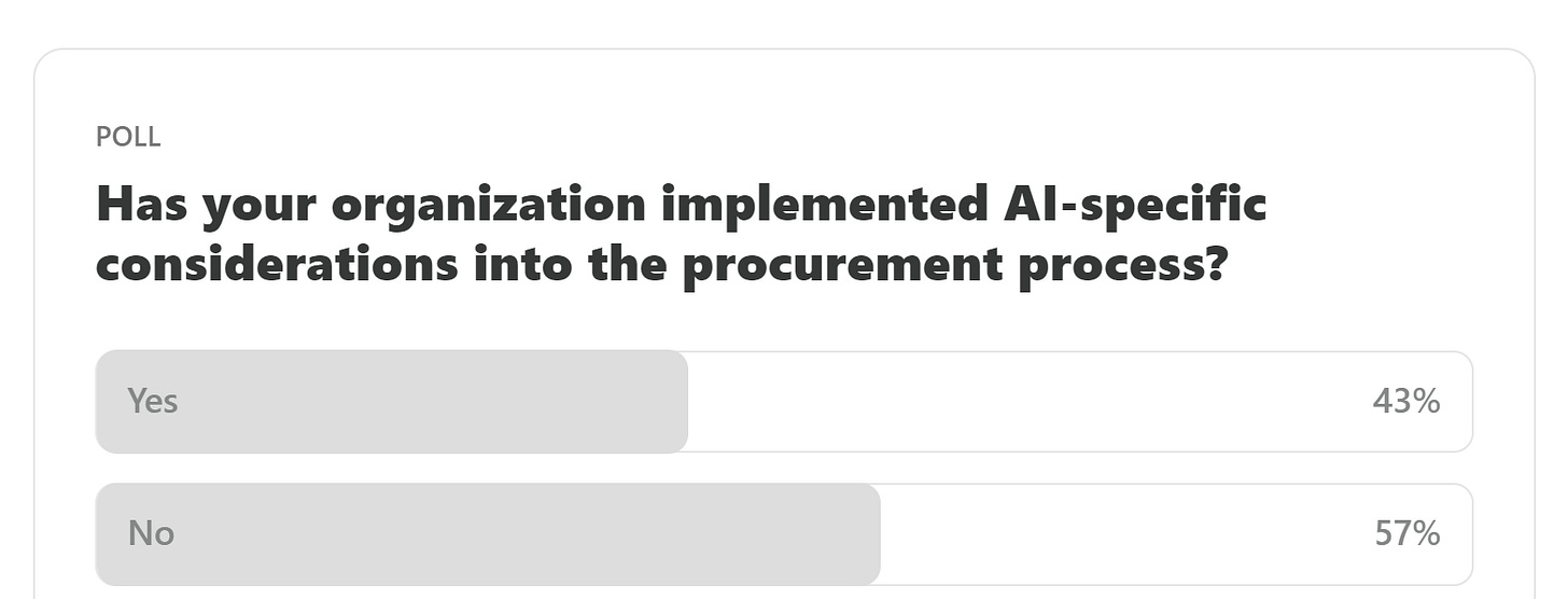 Given the low rates of AI-specific considerations in the procurement processes, what do you think are the primary reasons for this issue? Please let us know! Share your thoughts with the MAIEI community: